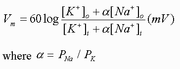This equation transforms into the Nernst Equilibrium potential if there is a lack of presence of either ion within this equation. The permeability portion (α) is important in determining voltage since a membrane can be one-hundred times more permeable to K+ than Na+ or vice versa, meaning that much more of that given ion would travel across the membrane, making it an uneven diffusion of the ions even if the concentrations of these ions are the same2.